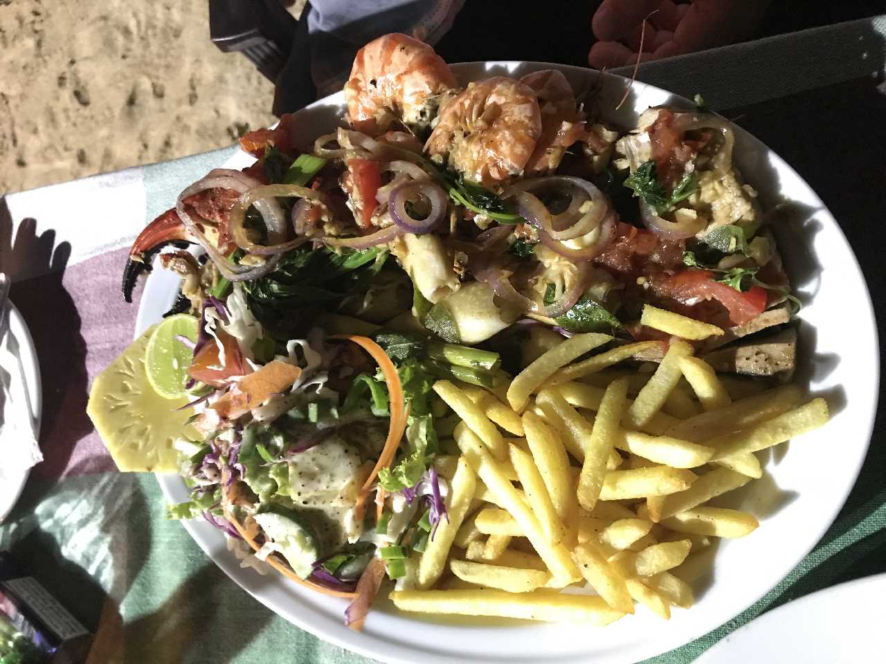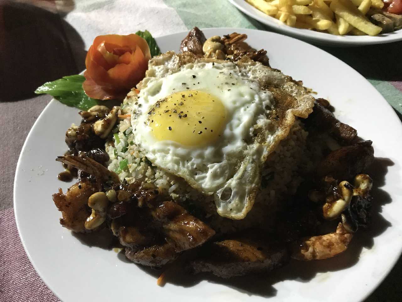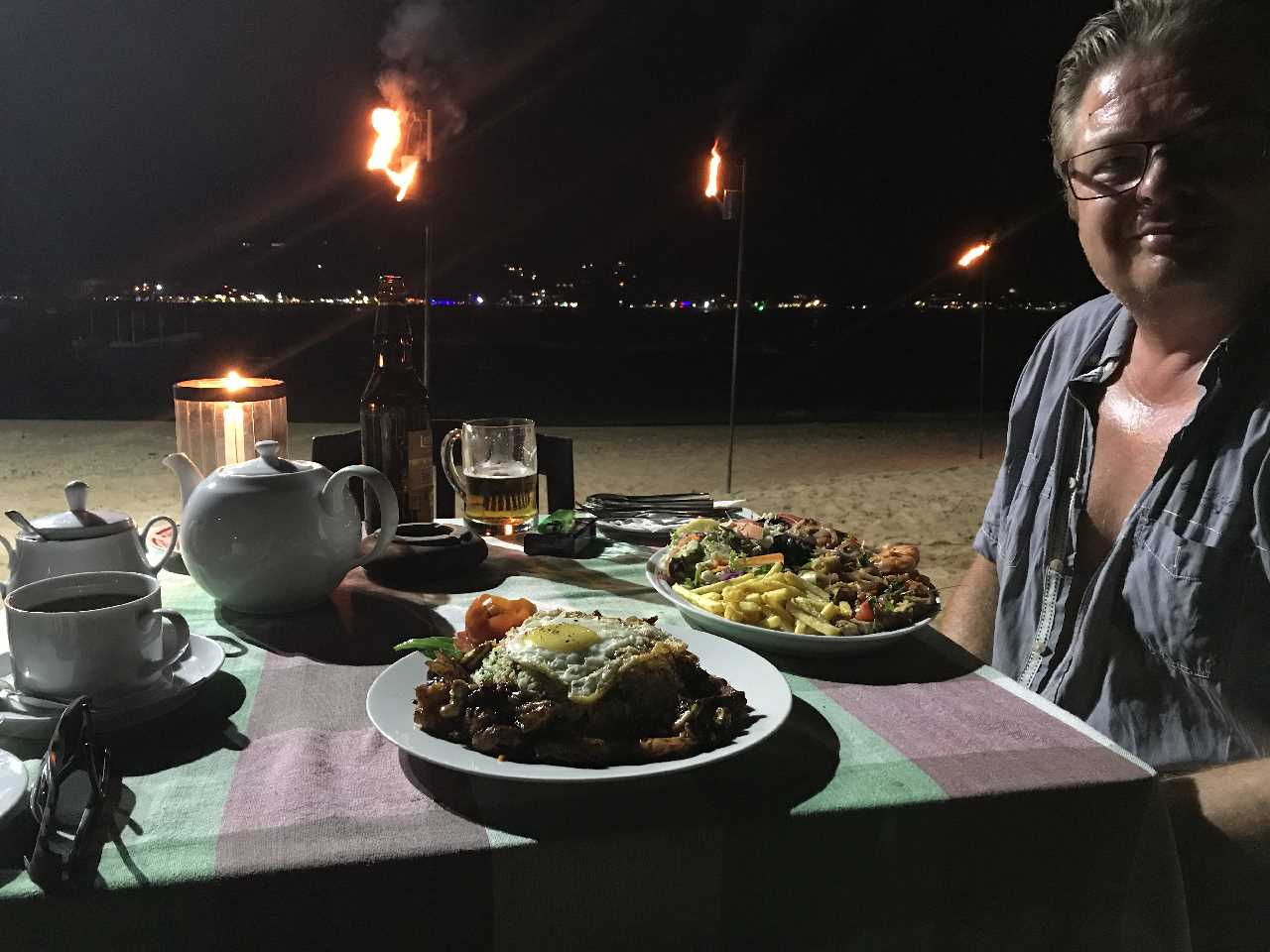 Wir planen noch den Strand abzulaufen und Geld zu beziehen, wenn der ATM will. Wir finden nen super Liegeplatz und Stefan geht alleine Geld holen während ich warte und das azurblaue Meer bewundere sowie den erfrischenden Wind mit dem Meerrauschen. Bis zum Sonnenuntergang bleiben wir am Strand, Essen am Abend am Bistro im Eck am Sandstrand Meeresfrüchte und spezial fride rice. Beides super lecker und riesen Portionen. Back home duschen im Stromausfall und Kerzenschein bis zum dodo. Der Strom wird Zonenweise ausgeschaltet, da ein Kohlenkraftwerk ausgefallen ist und es zu wenig Wasser hat für die Wasserkraftwerke!