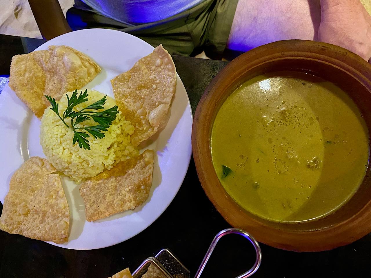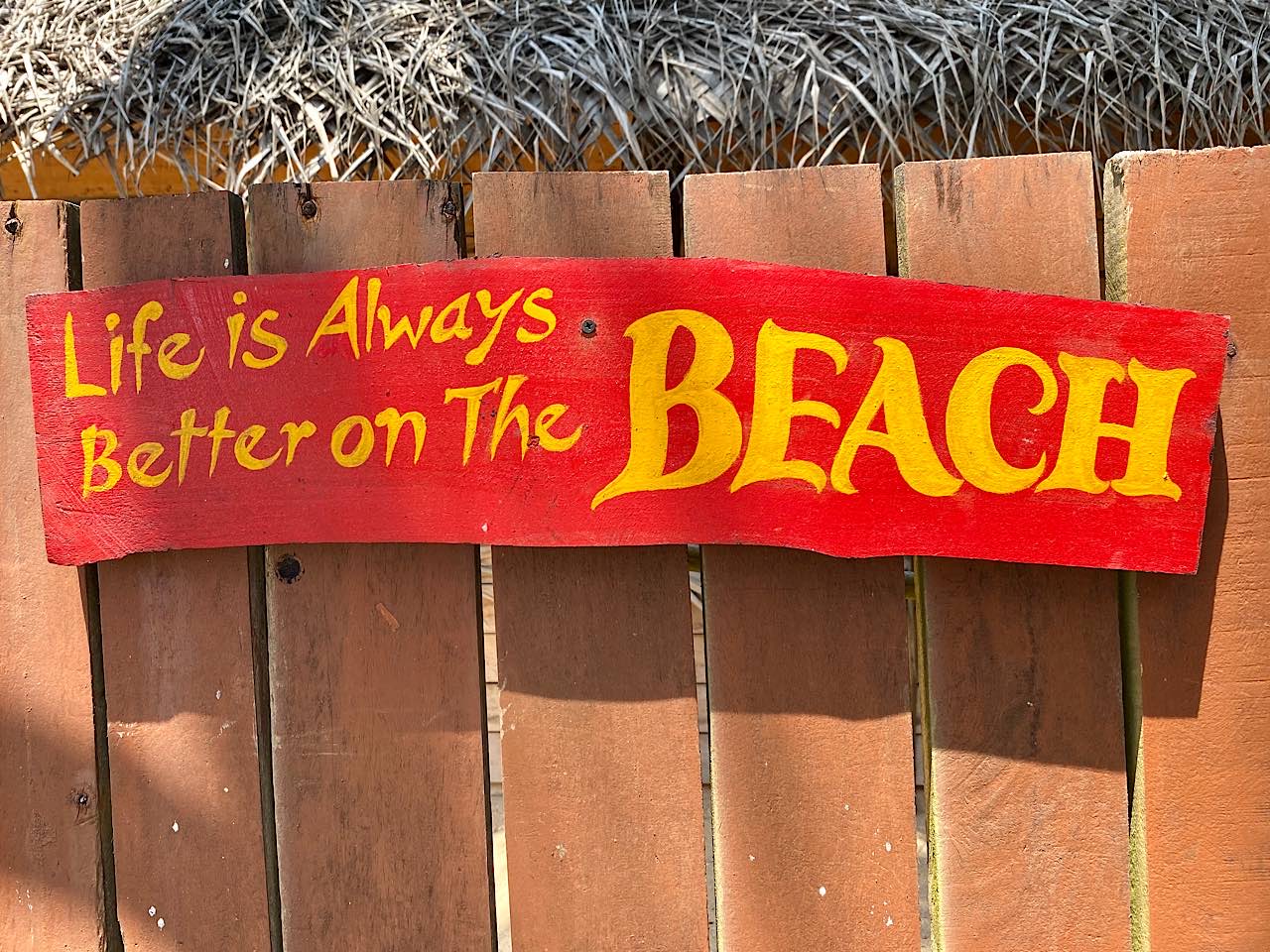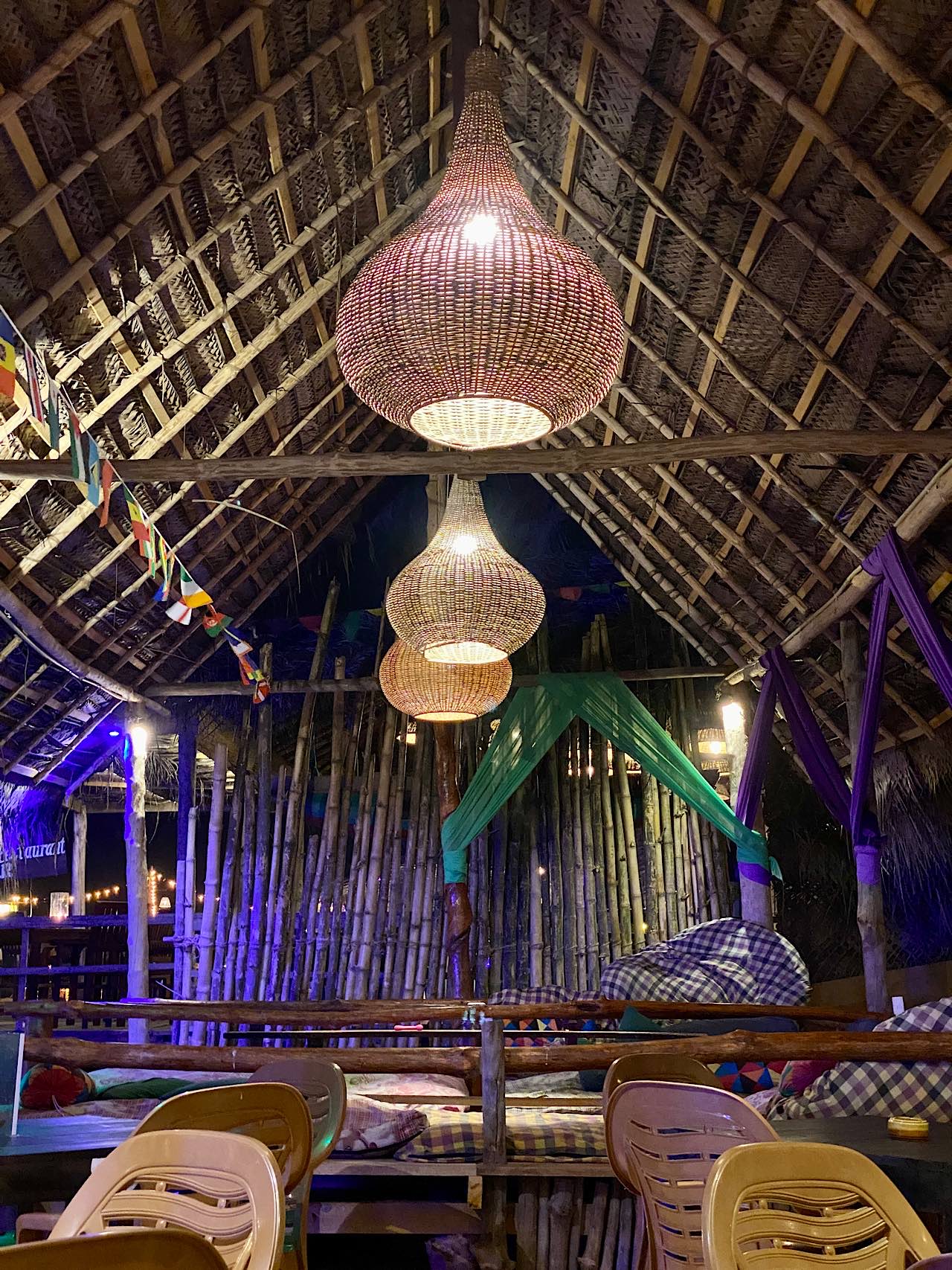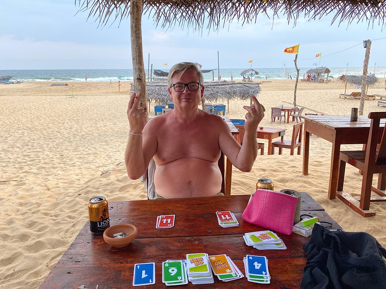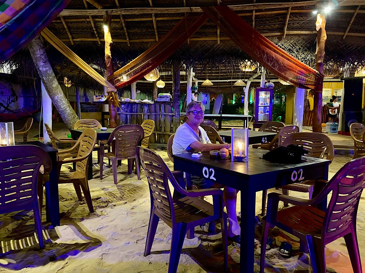 Skip Bo mit Ausgleich 74:74, die Sonne verabschiedet sich ganz im prächtigen Grau Ton 😀 und wir zotteln zur Strasse, wollten ein Roti Essen im Grocery mit halsbrecherischen Stiegen, doch die sieben Tische sind besetzt. Also gehen wir ins Joint Restaurant, nicht um den Namen zu rauchen 😂 um dort in einem wundervollen chilligen Ort mit cooler Musik und den Füssen im Sand zu Essen. Es war lecker, Stefan geniesst ein unscharfes aber auch gutes Poulet Curry mit Reis und Babsea, die wenig Hunger aufweist, nimmt einen Thunfisch Salat mit Avocado ( frischer Thunfisch, Nix von der Dose 👍🏼 )