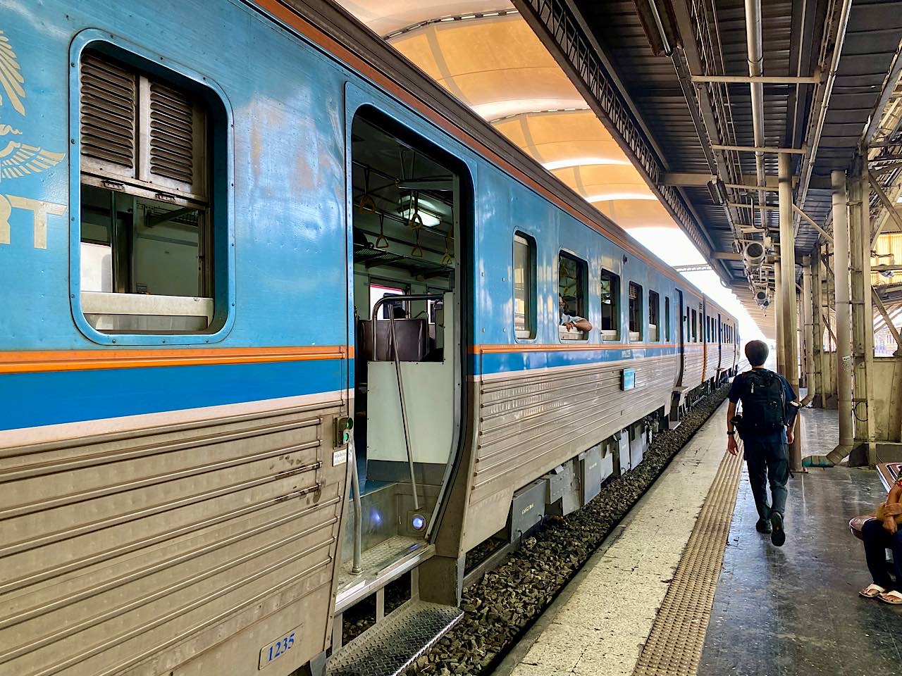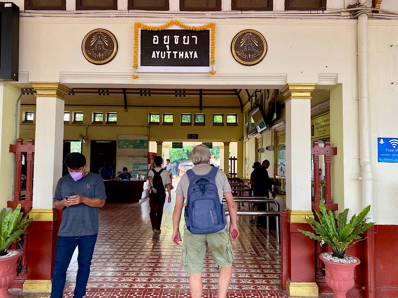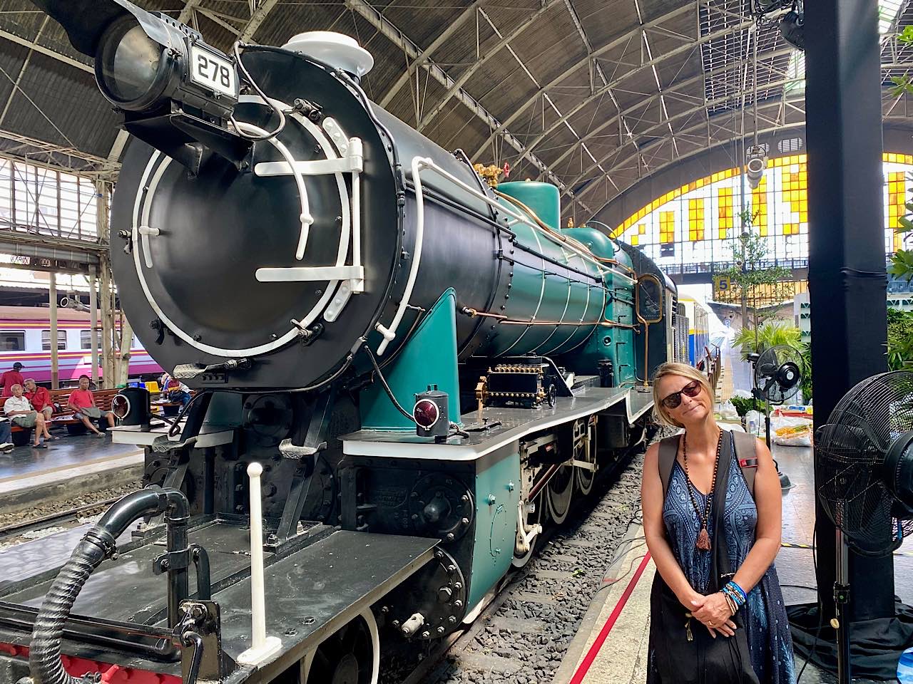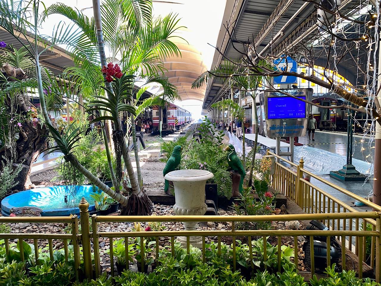 Wir erreichen den alten Bahnhof Hua Lamphong, dieser ist im Gespräch als Museum umgestaltet zu werden. Es ist ein Fest im Aufbau, so erscheint es uns. Tische mit weissen Tischtüchern, viele Pflanzen und Dekoration. Einfach sehr sehr sehr hübsch dieser Bahnhof und so hoffen wir, dass er einmal zum Museum wird. Die Züge fahren aber noch, und mit einem, auf dem Gleis Sieben fahren wir in 1.45 Stunden die 81 Kilometer nach Ayutthaya. Unsere günstigste Reise überhaupt 😅 Wir bezahlen schlappe 15 Bath pro Nase ( 40 Rappen !! ) in der nur existierende dritten Klasse.