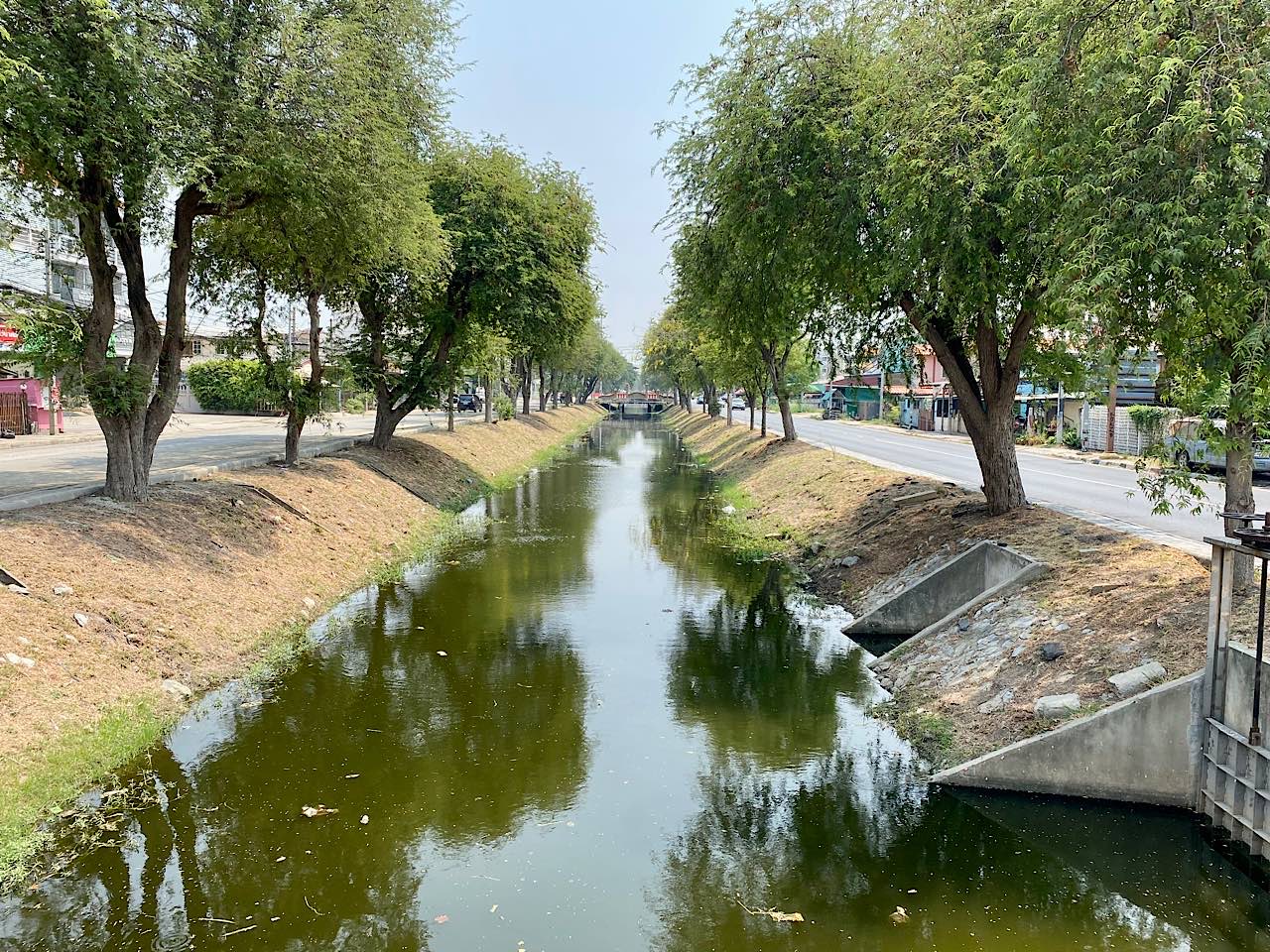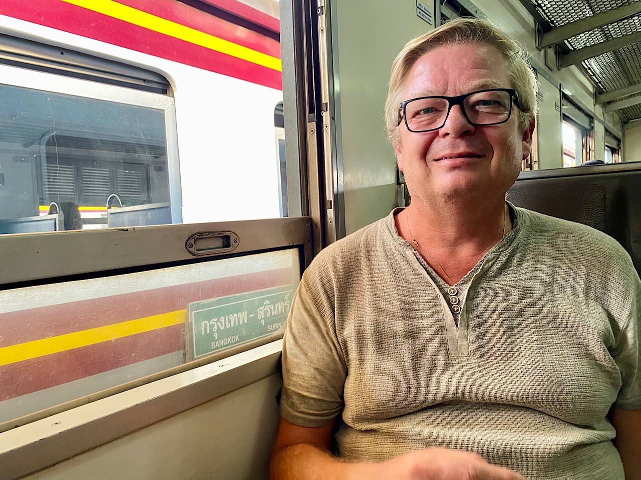 Nun sitzen wir und warten bis die deutlich hörbare Diesel Lokomotive startet. Wir beziehen als einzige Europäer im Wagon ein vierer Sitzplatz. Dieser ist aus Kunststoff und Stefan hat fast nicht Platz auf einem, denn diese Sitze sind für sehr schlanke Menschen gebaut. Unser Ventilator an der Decke ist nicht anwesend, so öffnen wir das Fenster und warten gespannt auf die Abfahrt. Die sich mit einem lauten Horn und dem schliessen der Türe ankündigt. Die Fahrt war so spannend, 50 Minuten um aus Bangkok raus zu kommen, nach der Dong Mueng Flughafen Haltestelle dann Reisfelder und kleine Dörfer mit deren grossen Haltestellen. Eine Baustelle begleitet uns ebenfalls ab dem Ende von Bangkok, man will hier eine Hochbahn nach Ayutthaya bis im 2027 bauen.