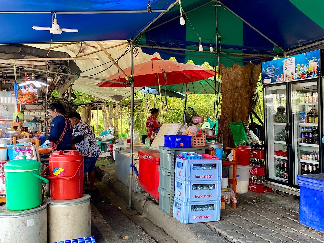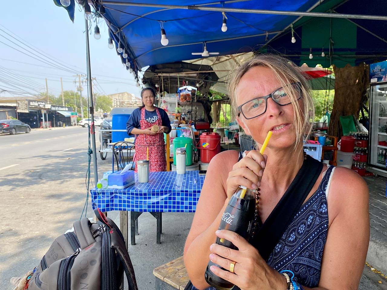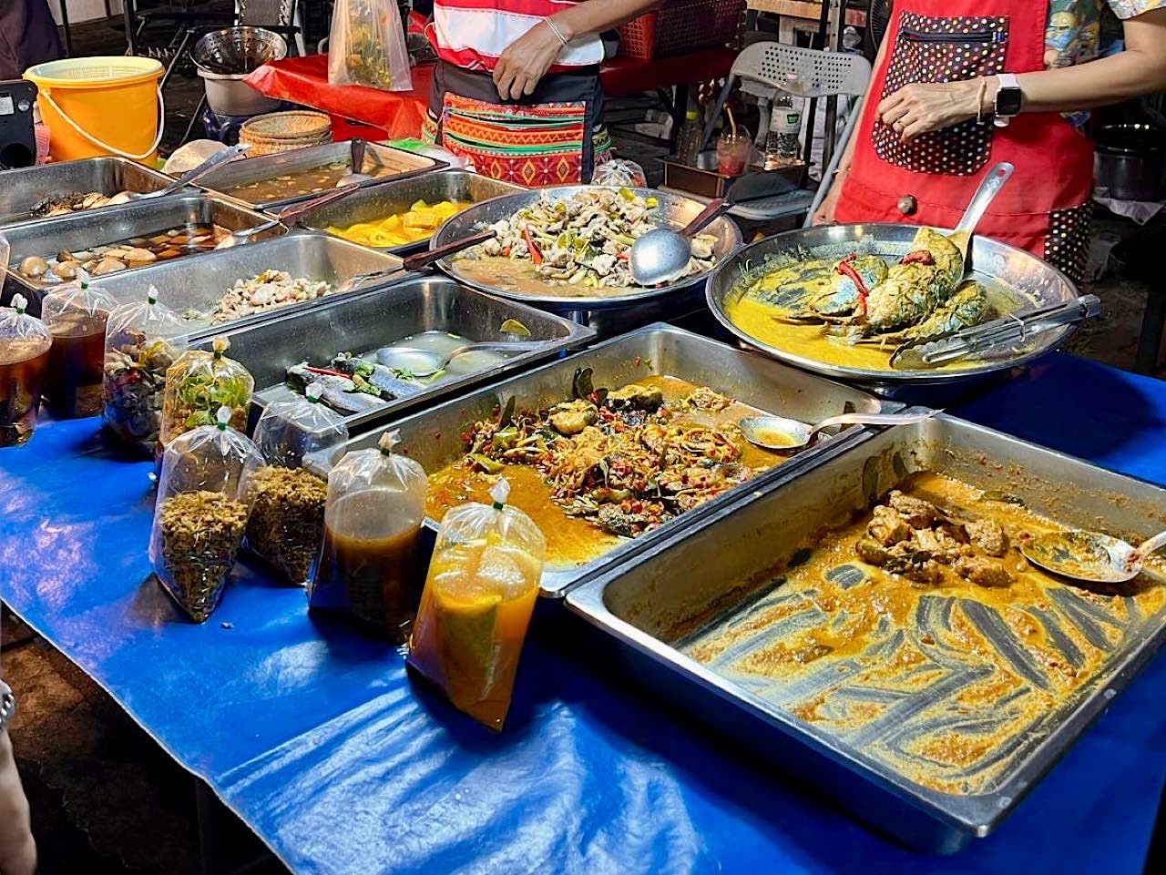 Dann zotteln wir durch den Nachtmarkt, der bei unserer Ankunft im Aufbau war. Unzählige günstige Leckereien. Stefan isst zwei Reiswürste ( 20 Bath ) und Pilze ( 50 Bath ) , Babsea geniesst einen frischen Fruchtsaft (35 Bath ) Alles war köstlich 🤩