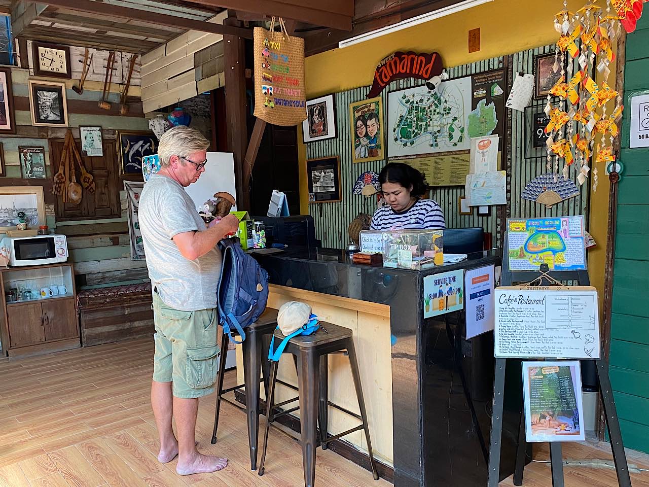Der Chauffeur kam uns einzigen weissen fünf Minuten vor Ayutthaya Bescheid sagen, dass wir nun Aussteigen können. Er hat uns gefragt von wo wir sind und auf unsere Antwort mit Switzerland zeigt er uns ein frösteln 🤗😊💪🏽 Im Bahnhof bei der Information für Touristen werden wir auch nach unserer Herkunft gefragt, die Antwort: ich kann ein Schweizer Wort…Roger Federer mit einem breiten und herzhaften Grinsen…😍💪🏽 Herrlich ♥️ Ayutthaya ist eine Provinz Stadt geblieben, die Tuk Tuk sind etwas anders hübsch…wir wollen aber zu unserer Unterkunft laufen um die Gegend zu erkunden/sehen. Babsea findet endlich ihre buddhistische Fahne in einem Geschäft ♥️ Erst nehmen wir die Fähre für 10 Bath pro Nase um auf unsere Seite des Flusses Pa Sak zu kommen. Sehr hat zu Stefans Freude viele typische Strassen Buden, bei einer lassen wir uns nieder und essen endlich um 14.00 Uhr etwas kleines für 215 Bath und es war sensationell 🤩