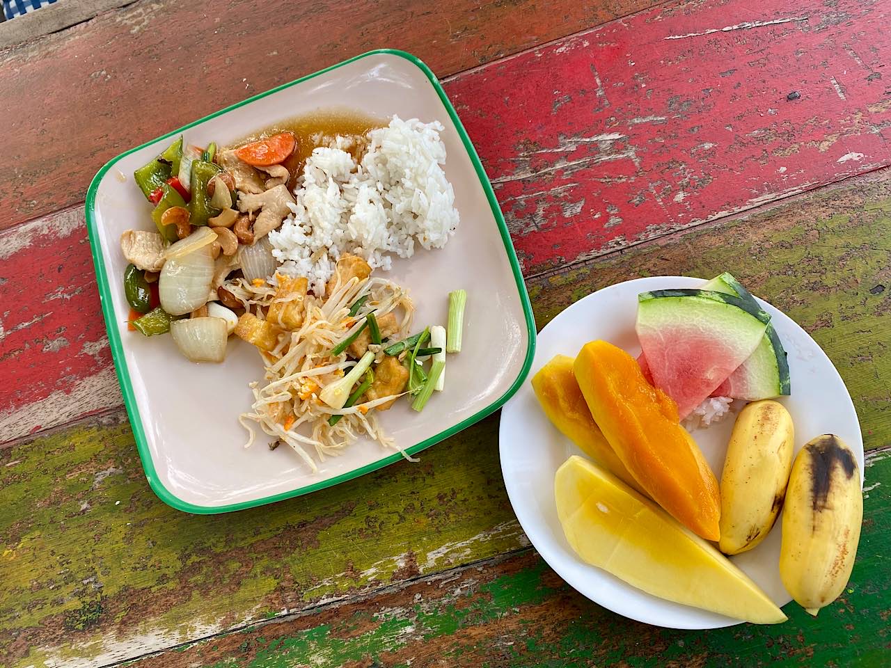 Unser Morgenritual findet unter einem bewölkten Himmel statt. Es ist fast kühl, mit der Betonung auf FAST 😇 Stefan hat sich ein T-Shirt angezogen beim Erwachen um 06.00 Uhr , das heisst schon was. Babseas Füsse sind noch Socken los 🤭 Die Wellen im wunderschönen Golf von Thailand, sind heute Morgen etwas kleiner zu gestern 💪🏽 Einfach schön, mit dem Meerblick am Tee zu nippen! Nun zum Frühstück kommen die Wellen gross und mächtig daher, wie auch ein wunderbarer Wind, der uns die Haare zerzaust 🤭 Herrlich mit dem Getöse des Meeres zu frühstücken. Auch ein paar Fliegen, die echt nervig sind…nicht der schöne Gecko und der Hund am Boden, die sind uns sehr willkommen 💪🏽