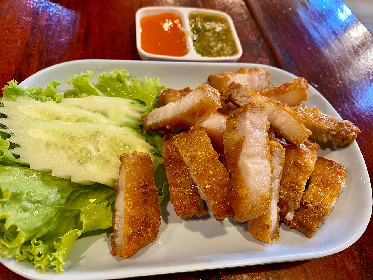 Ab zum Abendessen mit dem Roller….zwei Minuten….wir warten kurz beim Tumkorat Restaurant, ein thailändisches sehr typisches Restaurant natürlich 😇🤗, nun es ist wieder voll. Heute Abend warten wir….Beim Warten, bekommen wir zu trinken was wir gewünscht haben und schreiben selber das Wahlessen mittels Nummern auf der Karte auf 💪🏽👍🏼 Wir erhalten den Tisch Nummer zwei und geniessen die Atmosphäre ♥️ Stefan isst frittierten Schweinebauch der super zart war mit einem scharfen Papaya Salat und Babsea frittierte Shrimps. Die Gesellschaft des lieben Hundes inklusive und kostenlos @ Trix 🤗♥️ Es war sensationell köstlich, wir werden wiederkommen 🤭👍🏼Kostenpunkt: 410 Bath 😇😅dazu eine freundliche und sehr, beim Abschied herzliche Bedienung, Wai inklusive !