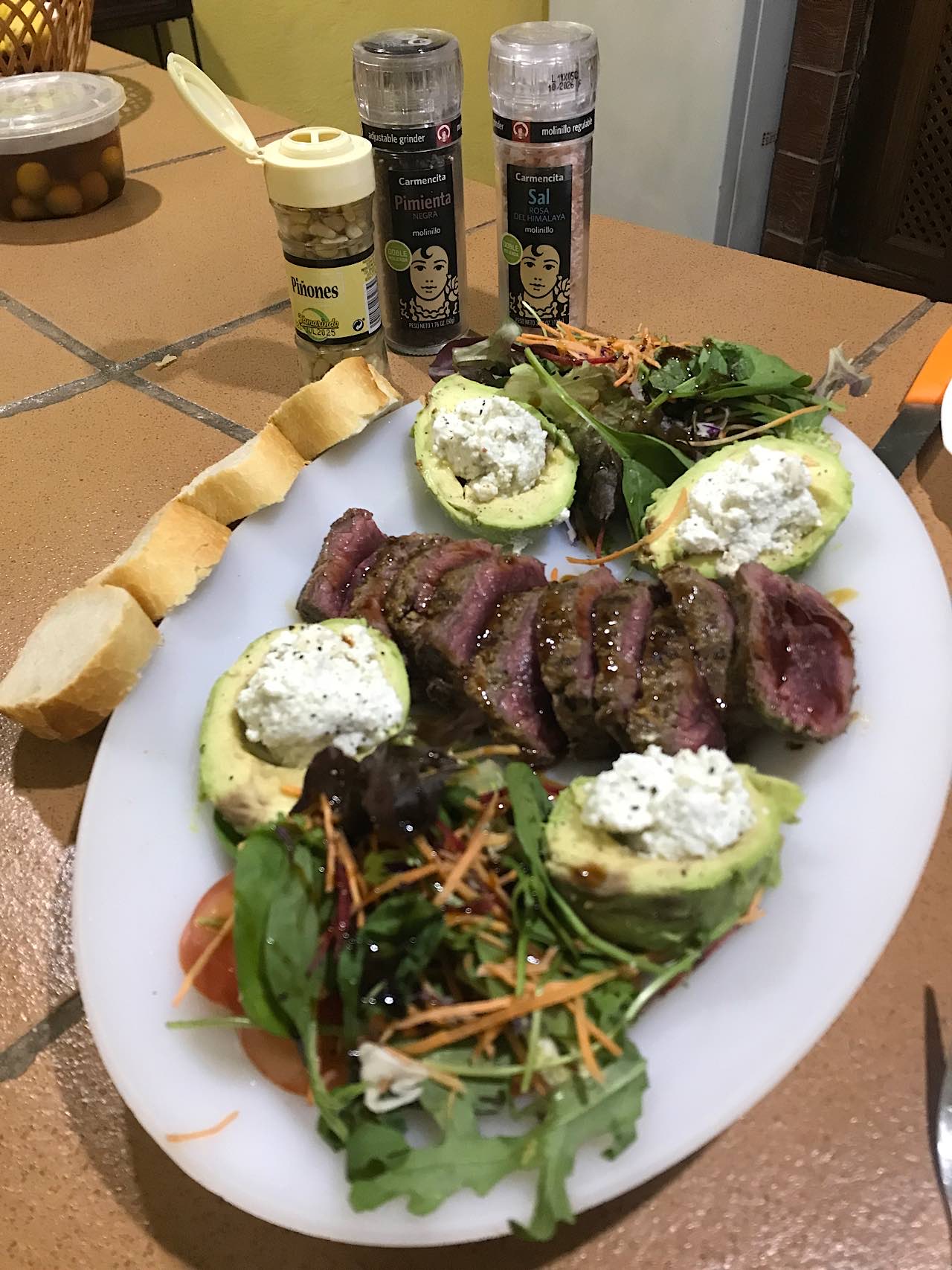 Zum Abendessen gibt es Rinderfilet ( 18€ das Kilo ) mit Avocado, Tomaten mit tenneriffischem Frischkäse und weissem Roquefort mit Salat and Baguette. Anders lecker, schon gediegen einen Sternekoch bei sich zu haben ⭐️⭐️⭐️⭐️⭐️ zur Beruhigung, ich übernehme den Abwasch 😂😇 paar spanische Süssigkeiten nach diesem Regentag für das Gemüt....ade Bikinifigur ( die ich eh nicht hab 😅 )