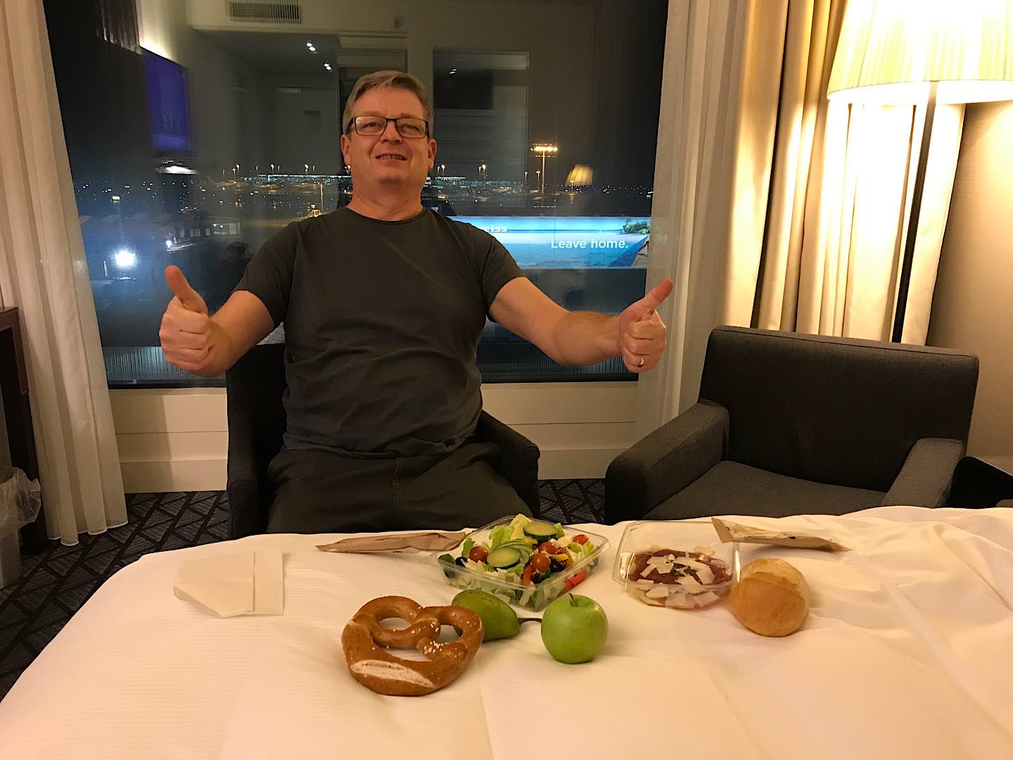 Das Nachtessen war super, ein Snack im Zimmer mit spannender Aussicht, die Polizei ist stark anwesend mit vielen Einsatzleuten vor dem Flughafen und sie checken jedes Auto das reinfährt genau....