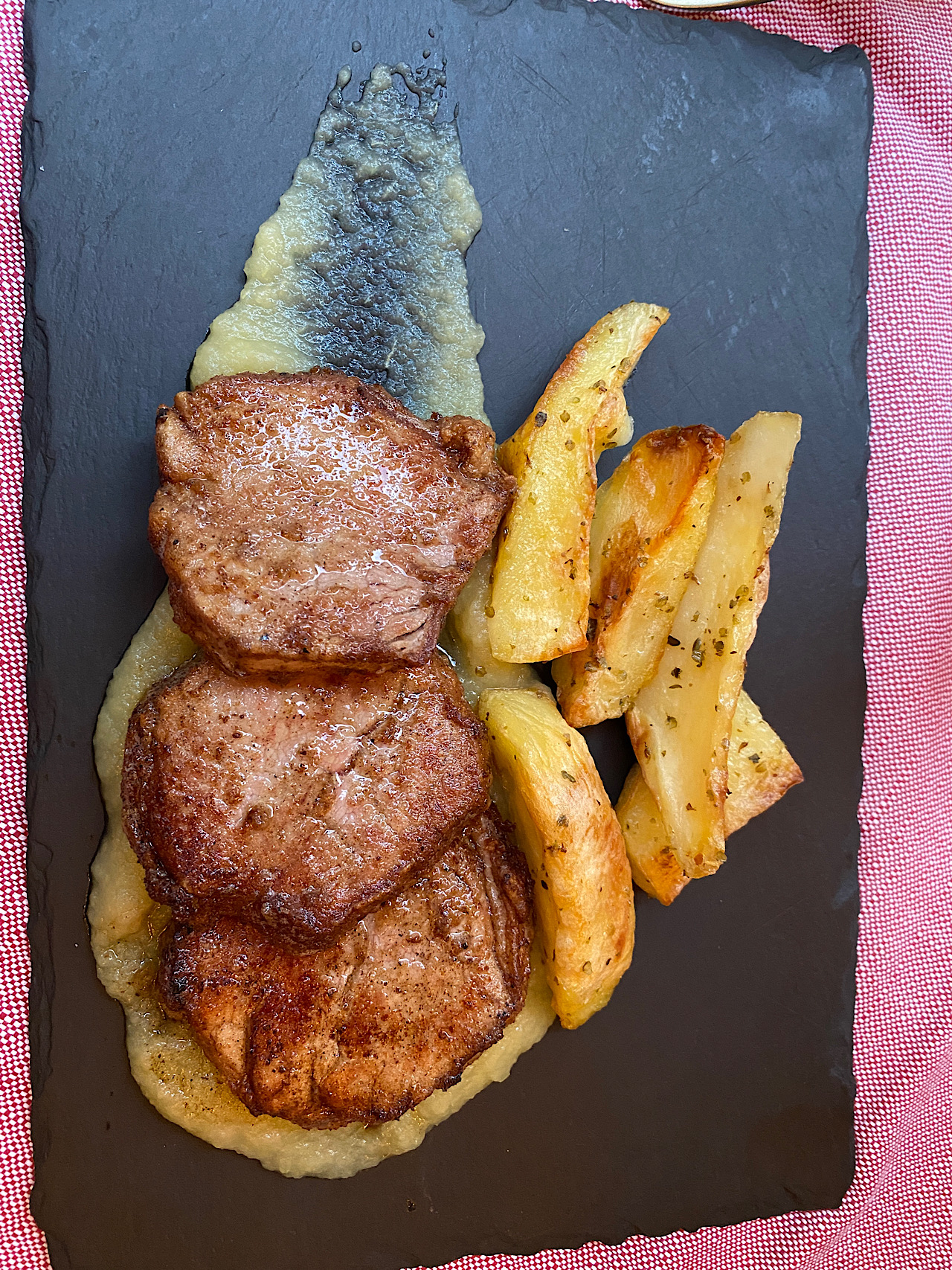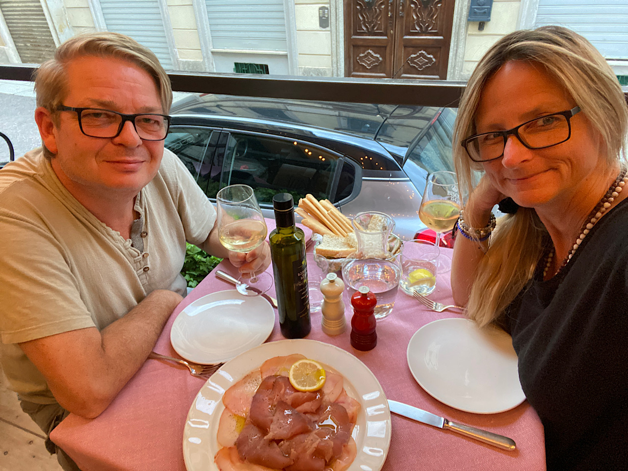 Wir essen bombastisch im Vineria Derthona 🫶 ein Schwert/Thunfisch Carpiaccio gemeinsam, Babsea gönnt sich Kalbskotelette mit Apfelmus, Stefan Lamm Koteletten an Honigsauce mit Kartoffeln. Ich wollte als Beilage Honig Zwiebeln und habe auch Kartoffeln bekommen. Immer passiert mir sowas… in den USA 🇺🇸 … in Indonesien 🇮🇩 ebenfalls 😅 Ich nehme es gelassen 😏 Beide natürlich mit Wein und Wasser… als Abschluss schlemmen wir ein Gianduia Mascarpone Dessert 😇 @ Cyrill mit einem Amaretto 🤗😉 der Kostenpunkt für dieses göttliche Abendessen: 80 Euro 😍