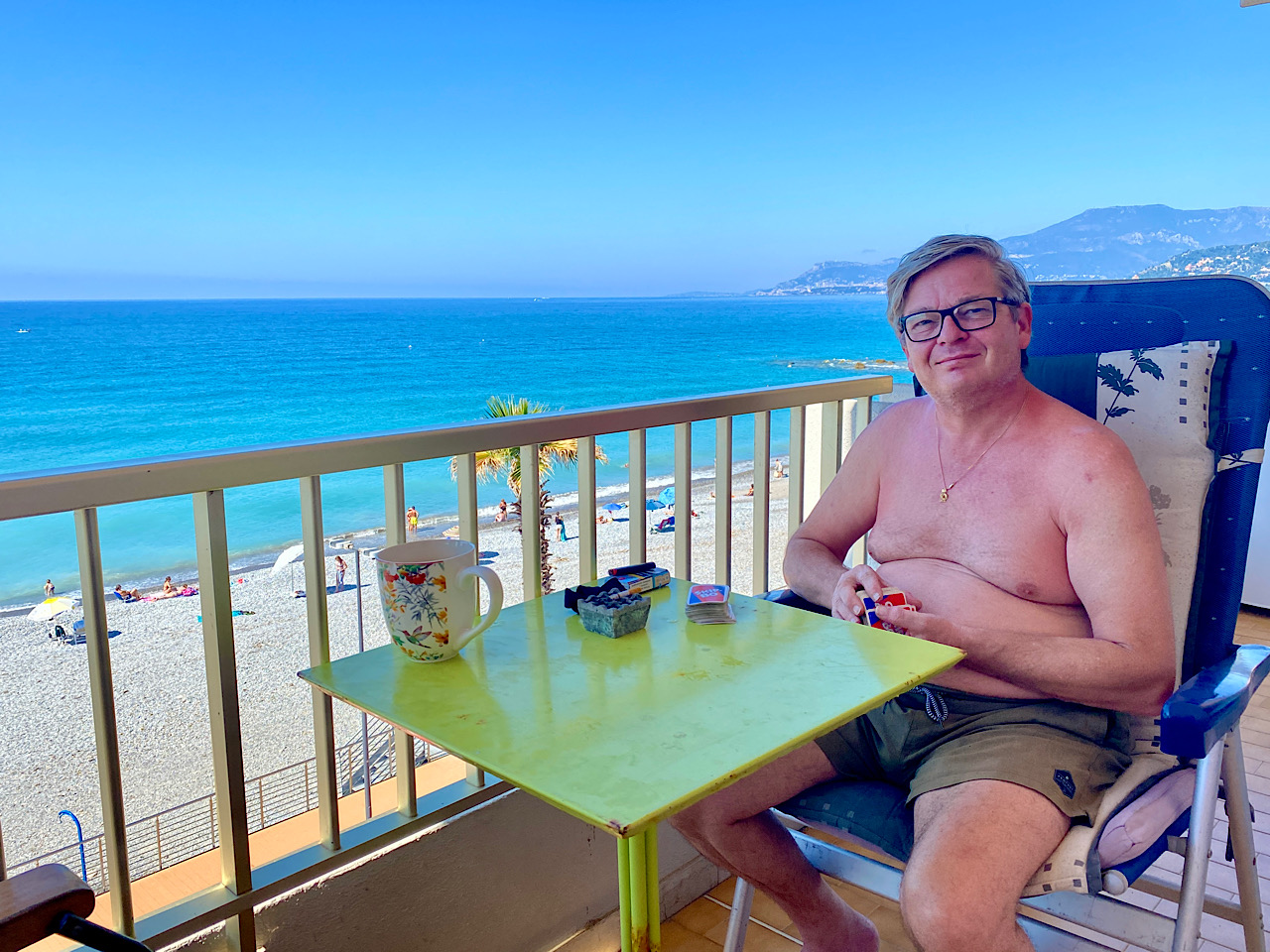 Um fünf Uhr ziehen wir uns auf Balkonia zurück. Babsea hat einiges aufzuholen beim Skip Bo Spiel….neuer Spielstand: 93:87 ( ich habe ein nur wenig aufgeholt 😅 aber immer hin…)