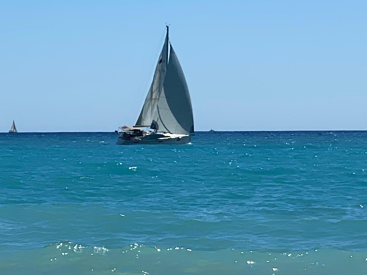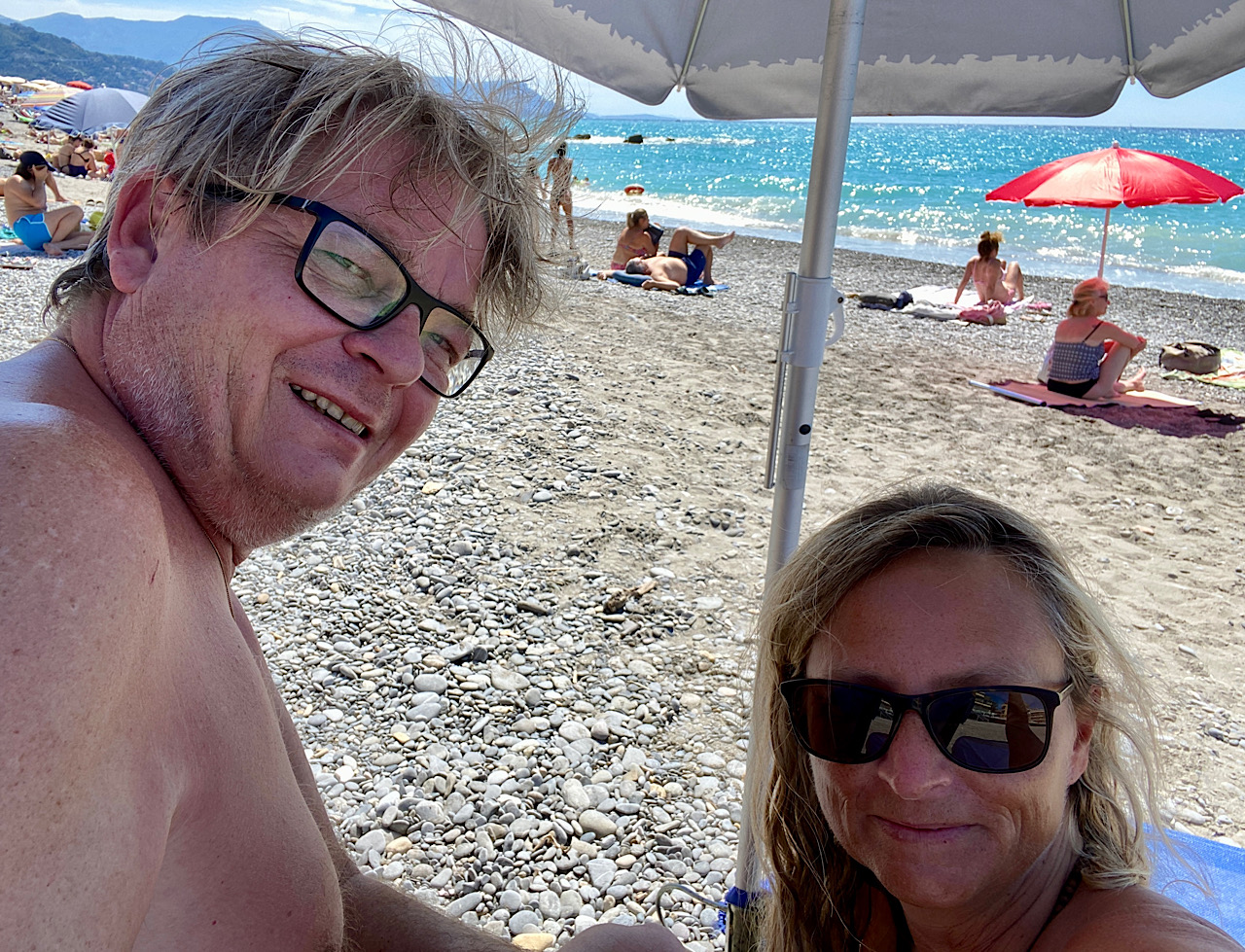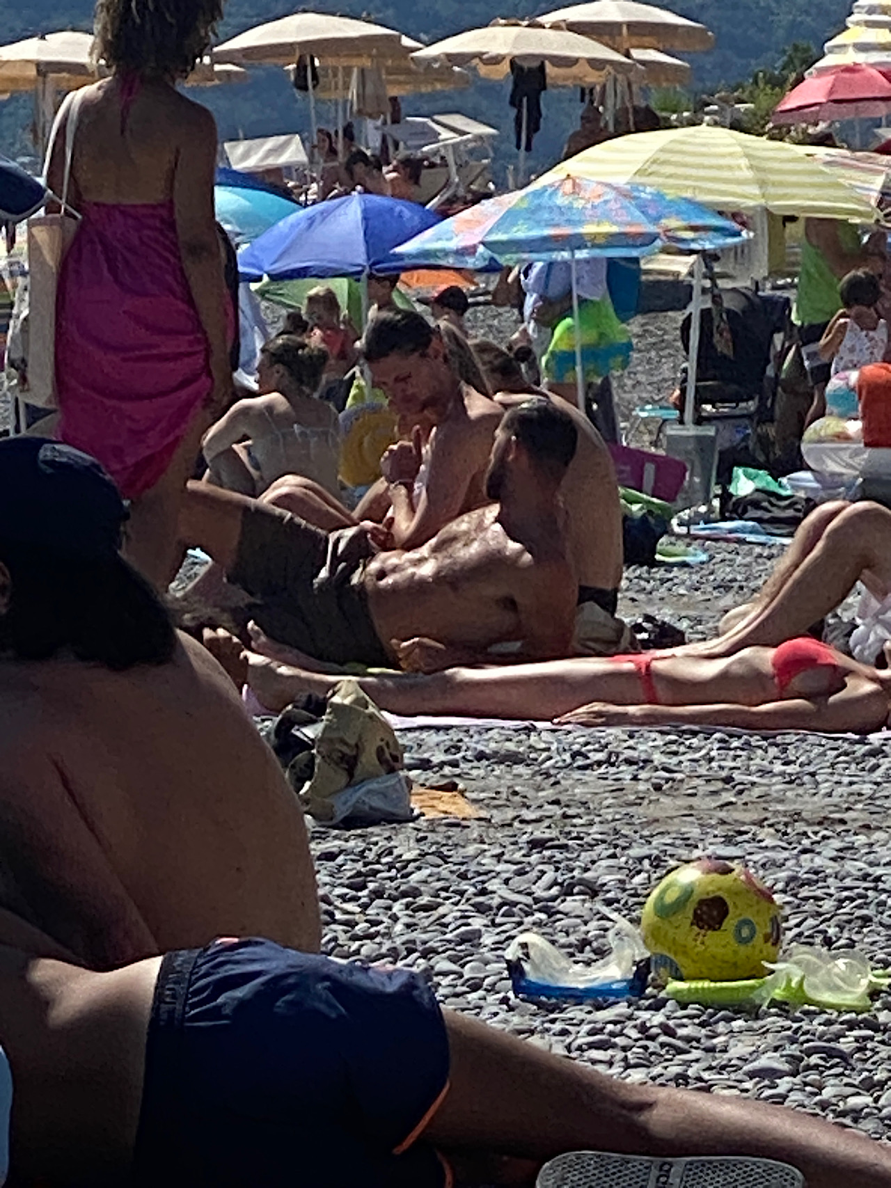Ab geht es freudig zum Strand, der für einen Samstag kaum gefüllt ist 👍🏼💪🏼 und wir stürzen uns wortwörtlich ins wundervolle Mittelmeer…eine geschätzte Abkühlung zu wunderbaren 28 Grad Temperaturen an Land im Schatten🫶🏽🤩 Die Wassertemperatur ist auf herrlichen 24.9 Grad. Laut Google 1.7 Grad wärmer seit unserer Ankunft 🙂↔️ zu unserer Freude werden die Wellen immer höher und wir haben uns mit der Menschen Menge doch noch geirrt, der Strand wurde sehr voll. Dabei war auch ein junger Mann, der ein Zwillingsbruder von Michael sein könnte, ( etwa grösser und schmächtiger, geht klar !! ) zu meiner Freude, hat ihn Stefan entdeckt. Klar habe ich ihn abgelichtet, was meint ihr ?